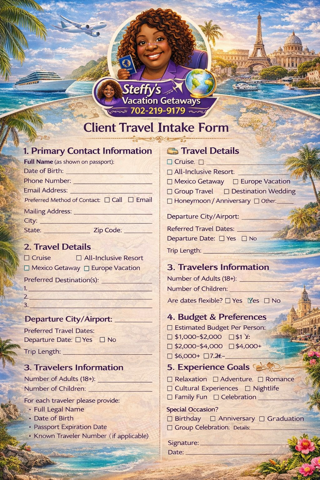 Clients agree not to initiate credit card chargebacks for services properly rendered. Disputes must be submitted in writing within 7 days after travel completion to mssteffysvacations@att.net or 702-219-9179.